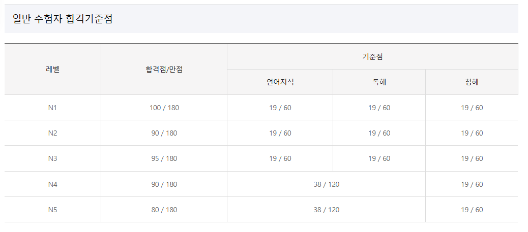 다른 레벨(N1~N5)도 살펴보니 영역별로 32% 이상 받고, 총점에서 50% 이상 받아야 합격입니다.